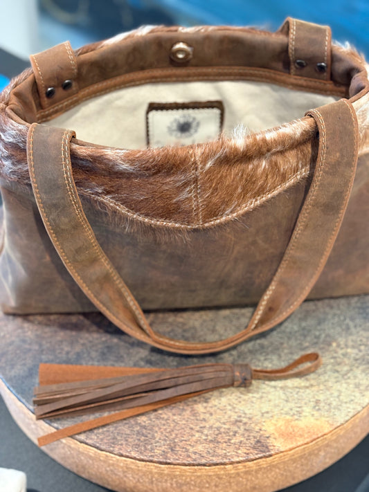 Leather Shoulder Bag with Hair on Hide Accent